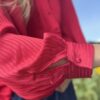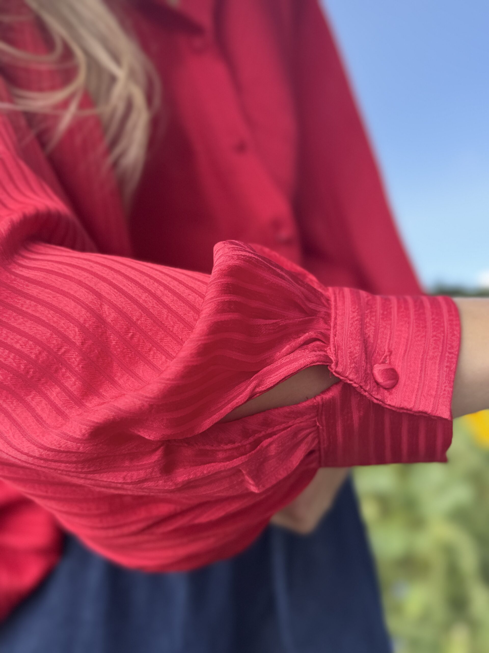 Voeg een vleugje elegantie toe aan je outfit met deze satijnachtige blouse in een warme rode tint. de subtiele streepjes in de stof zorgen voor een leuk detail, terwijl de pofmouwen de blouse een vrouwelijke en trendy uitstraling geven.